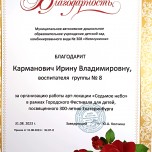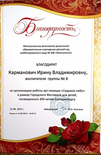 Благодарность за организацию работы арт-локации «Седьмое небо» в рамках Городского Фестиваля для детей, посвящённого 300-летию Екатеринбурга